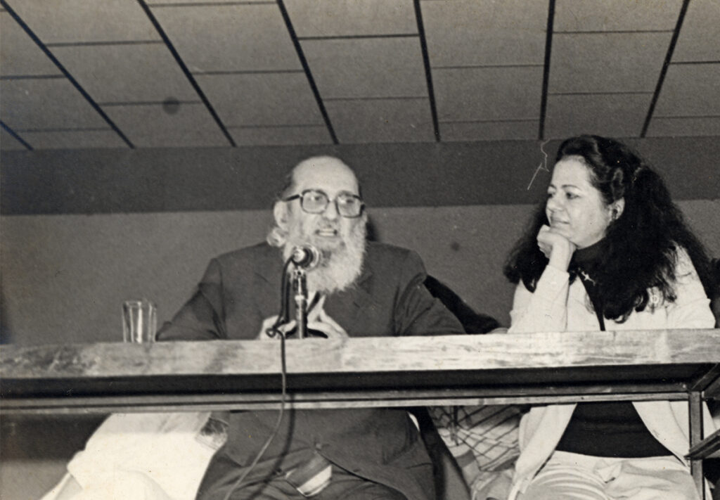 Paulo Freire e Ana Mae Barbosa durante a conferência de abertura da Semana de Arte e Ensino na Universidade de São Paulo, 1980 | Acervo Ana Mae Barbosa