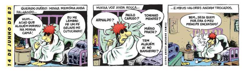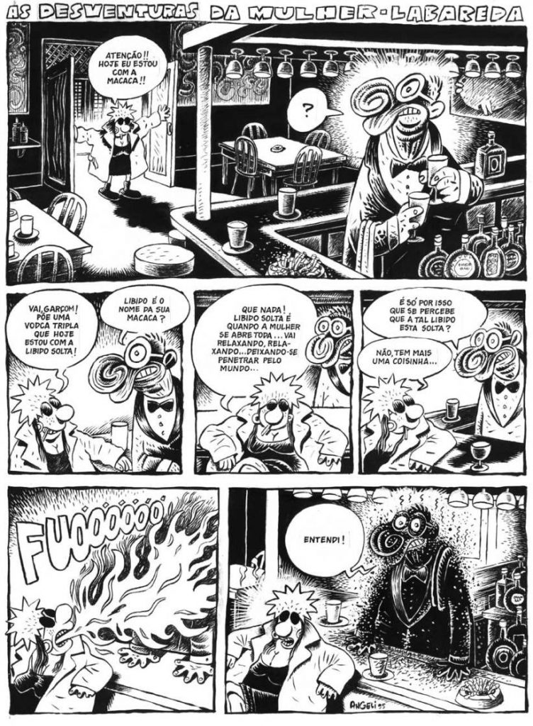 A contragosto de muita gente, em dezembro de 1987 Angeli matou RÊ BORDOSA. Homicídio não, cirrose também não, aids tampouco. A porra-louca morreu por infecção de um vírus poderosíssimo, o tédius matrimonius – símbolo encontrado pelo cartunista para culpar a verdadeira praga contemporânea, o tédio, a falta de sentido. E nada de adoecer e agonizar, Rê Bordosa simplesmente EXPLODIU.