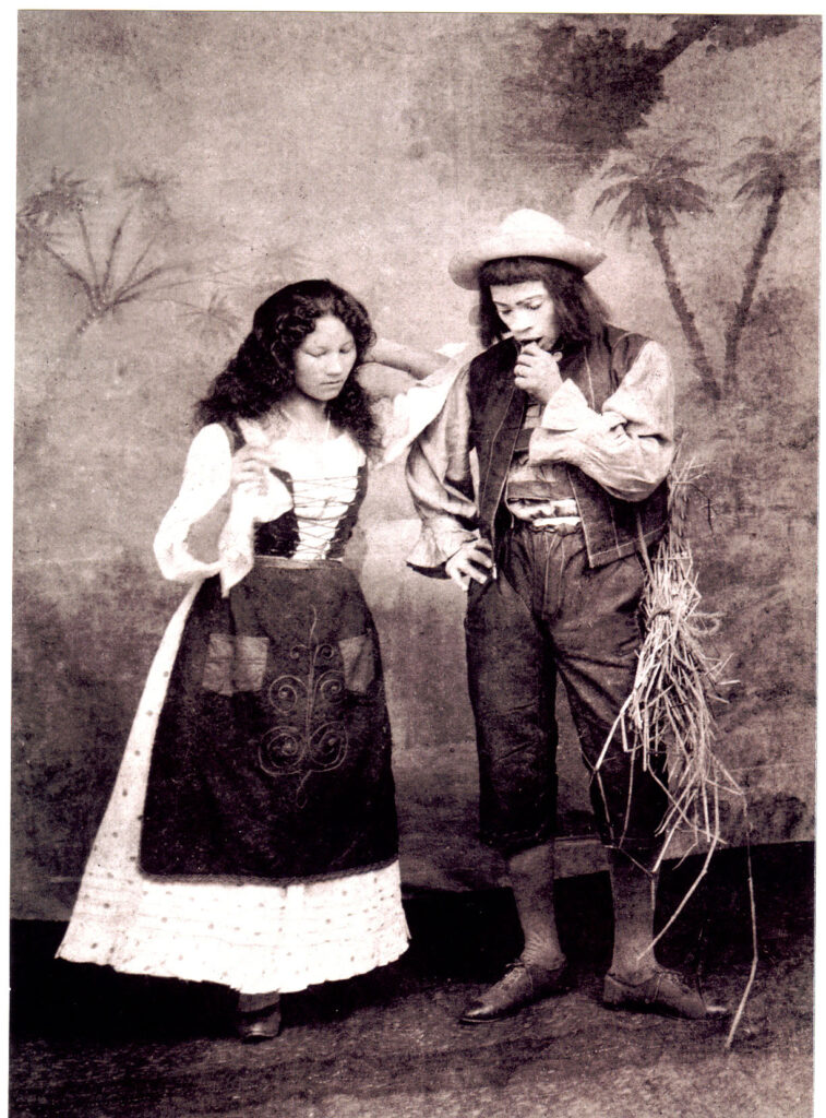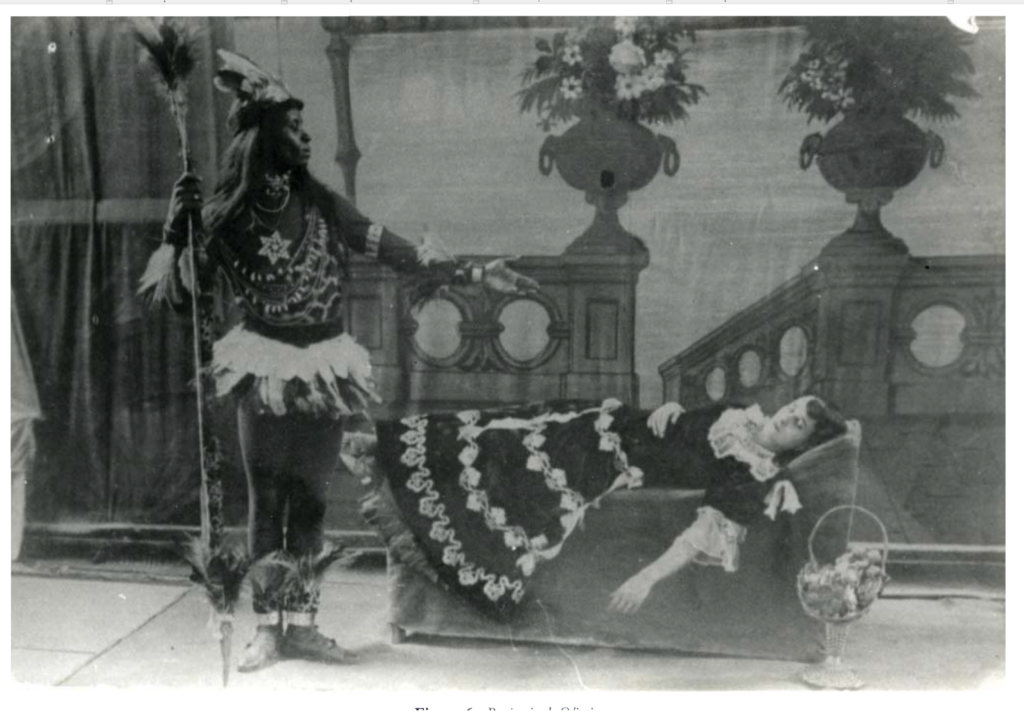 Cena da pantomima "D. Antônio e os Guaranys", com Benjamim de Oliveira como Pery e Ignez Cruzet como Ceci, em 1902, quando estreou em São Paulo, no Circo Spinelli. A mise-en-scène ficou a cargo de Benjamim e do palhaço Mr. Cruzet, e parodiou o romance "O Guarani", de José de Alencar (Fonte: SILVA, Daniel Marques da. Do moleque beijo ao mestre de gerações. Repertório – teatro & dança, São Paulo, ano 13, n. 15, p. 131-136, 2010. Acervos Erminia Silva/Família de Benjamim de Oliveira)