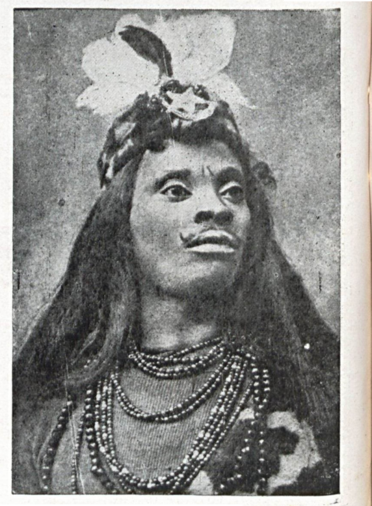 Benjamim de Oliveira representando Pery em uma cena da pantomima D. Antônio e os Guaranys (episódio da história do Brasil), em 1902. Todo o figurino de Pery foi produzido pelo próprio artista (Fonte: SILVA, Erminia. Circo-teatro: Benjamim de Oliveira e a teatralidade circense no Brasil, 2009, p. 212. Acervos Erminia Silva/Família de Benjamim de Oliveira)