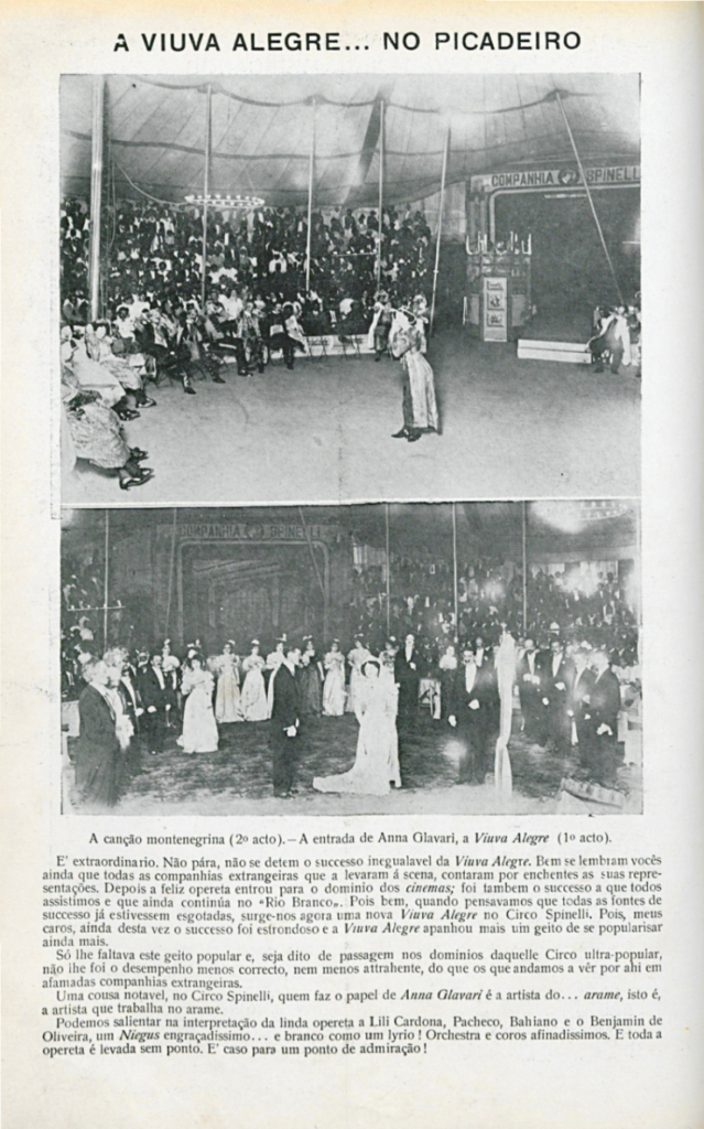 Crítica com fotografias da opereta "A viúva alegre", encenada no picadeiro do Circo Spinelli por sua companhia de artistas em 1910. Destaque para a equilibrista circense Lili Cardona como a personagem principal, Anna Glavari (Fonte: revista Fon fon, Rio de Janeiro, ano IV, n. 13, 26 mar. 1910, p. 10)
