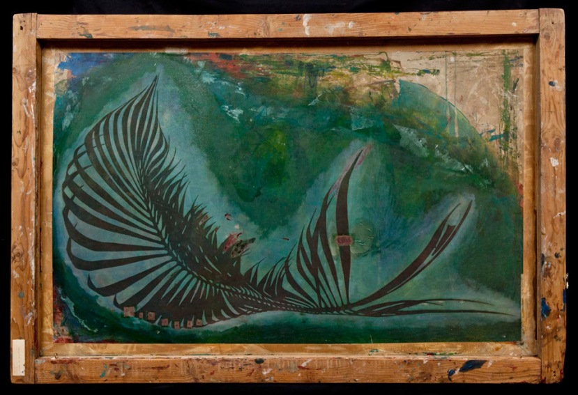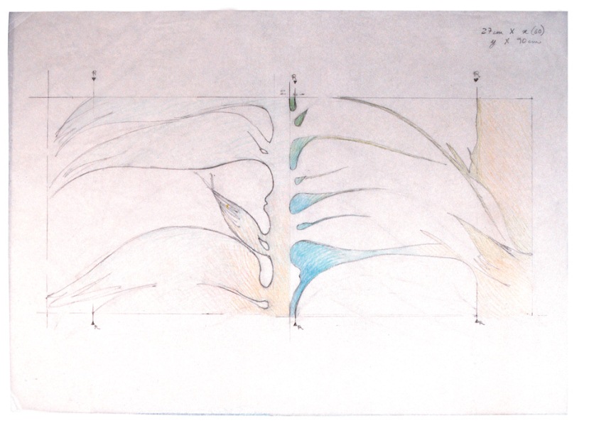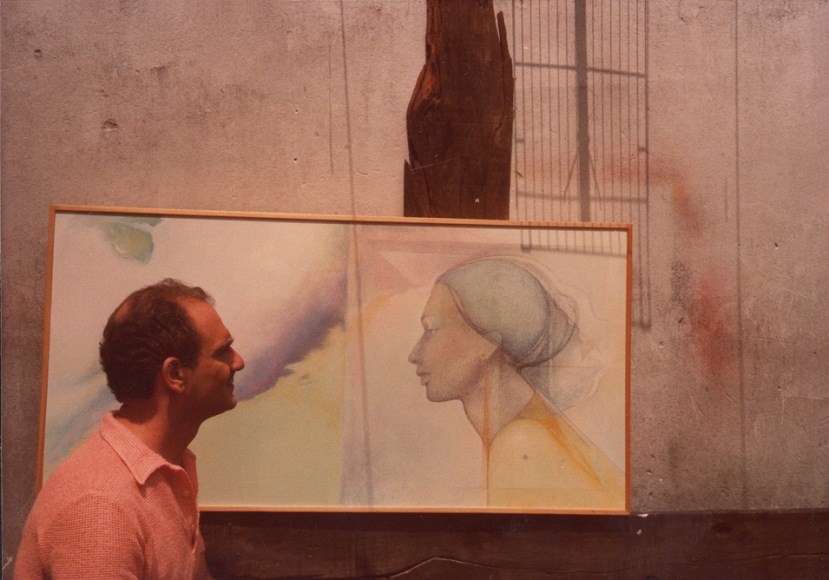 Flávio posa junto à obra em técnica mista (lápis e acrílica sobre tela), São Paulo, 1979