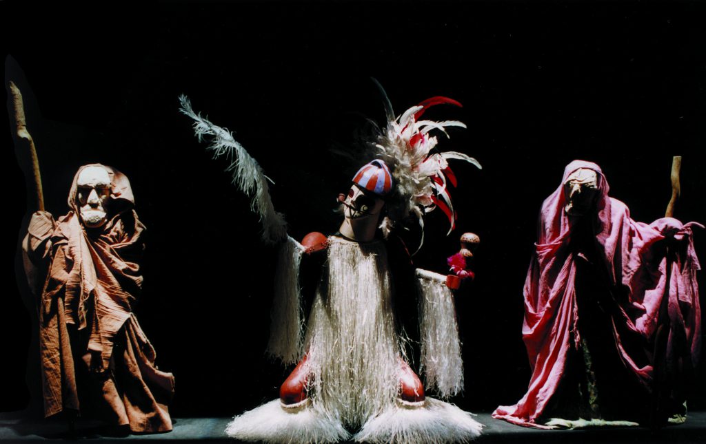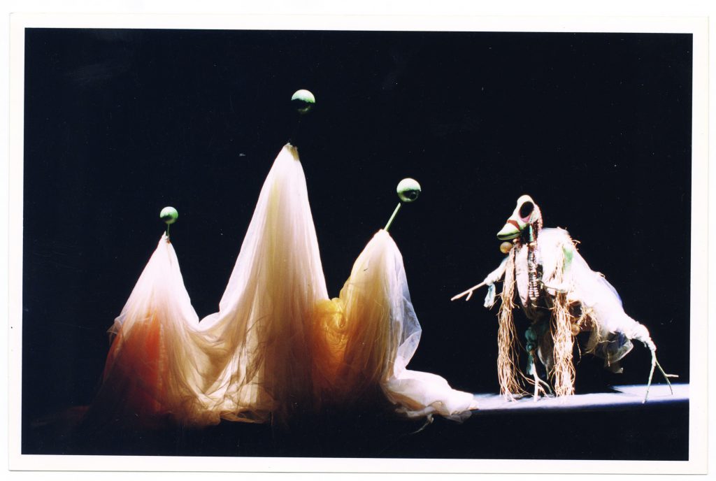 Para explorar os aspectos grotescos, caricatos, construiu marionetes à tringle e de fio, as quais, embora mais complexas para manipulação, possibilitam gestualização e movimentos mais ágeis, além de expressão corporal mais refinada. A exploração da espacialidade, como suporte da expressão, não era novidade, mas, nesse espetáculo, respondia de maneira muito original à atmosfera sufocante criada pelo autor. Para sustentar esse clima, contribuíram tanto o cenário e a iluminação, como a música que Lindembergue Cardoso, nesse trabalho, voltou a criar magistralmente, reafirmando a produtiva aliança com o Giramundo, iniciada na peça Cobra Norato.