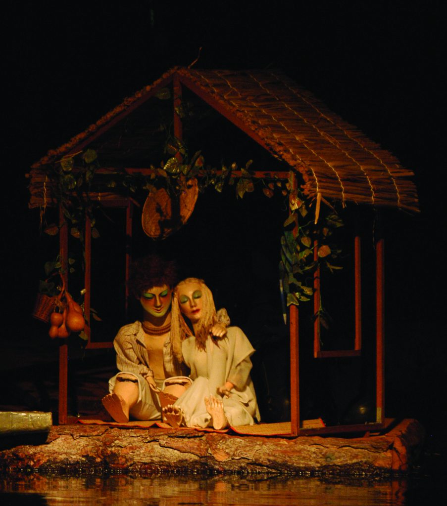 Dentro dessa paisagem, criada pela interpretação e pela música de Lindembergue Cardoso, inserem-se personagens tridimensionais, inspirados na estatuária popular. Os bonecos convidam a uma viagem através de uma paisagem caracterizada pelo gigantismo. É um convite, sem dúvida insinuante, que segue os movimentos coleantes da cobra-homem. O mistério lodoso dos mangues amazônicos é atenuado pela representação faceira dos personagens. A sugestão antropomórfica que predomina torna possível acreditar que a selva é antes de mais nada uma entidade que manifesta e abriga a vida. Aos poucos, o espetáculo vai iluminando as quase infinitas possibilidades de beleza dessa massa vital, separando um detalhe e integrando-o depois na totalidade evocada pela narração.