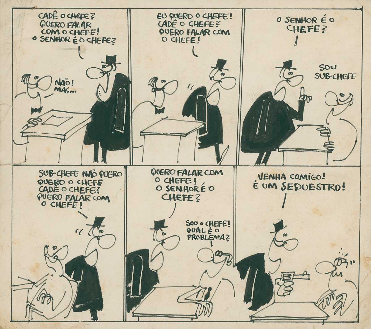 “Diante de mim estava um jovem inquieto, de aparência rebelde – pelas roupas, pelo cabelo, pela barba… –, armado com uma pasta repleta de quadrinhos e desenhos. Eu já o vira por ali, circulando com uma tribo ligada em música e outras formas de afirmação artística e pessoal. Nós só havíamos trocado olhares e palavras até então, mas agora era diferente. – Eu queria fazer uma tira com história em quadrinhos, com isso me sinto à vontade. Fazer charge política, num desenho só, acho que não… Acho que não!