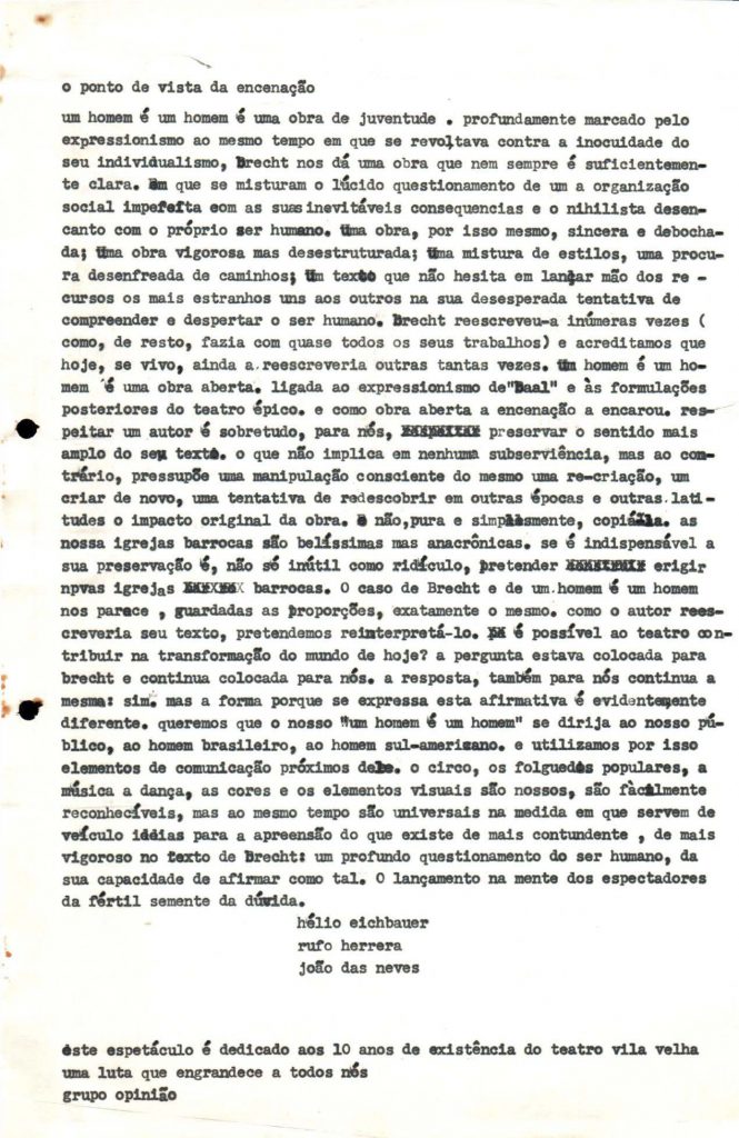“Luiz, o que é que nós sabemos? Nada. A não ser que eles estão lá na frente armados até os dentes e querendo nos eliminar. Que eles sempre estiveram à frente e armados até os dentes. Enquanto isso nós falávamos, cantávamos, representávamos e nem fomos capazes de ao menos prevenir dois pobres diabos* que não tinham nada com isso. Que só queriam acabar o seu trabalho e voltar para suas casas.” [*Referência aos pintores assassinados por rajadas de metralhadoras ao pular a quarta parede, comum a todos os palcos italianos.]