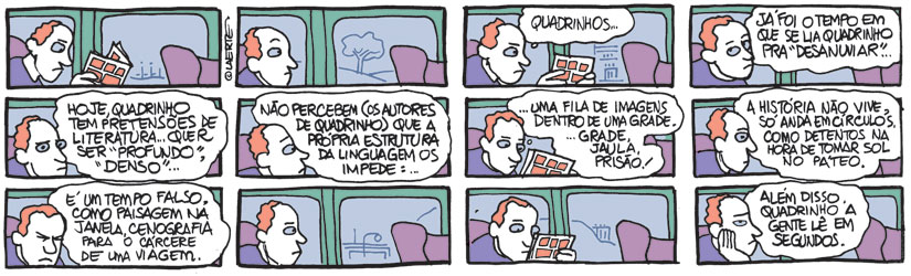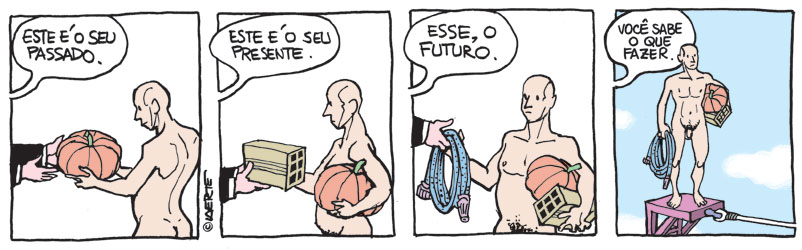 Há artistas que se agarram a uma ideia boa durante toda a vida – pense em personagens como Garfield e Hagar –, ideias que Laerte tinha semanalmente e não hesitou em descartar. Há artistas que, compreensivelmente, se dão por satisfeitos quando operam uma revolução no meio em que trabalham – pense no que o próprio Laerte estava fazendo com os Piratas do Tietê nos anos 1980. É relativamente fácil para um artista fixar sua obra no auge e transformar esse auge na planície que vai explorar a vida inteira. Laerte é um artista sem auge. Não parece estar procurando planície alguma. Recusa o humor com a mesma facilidade que rimos de suas piadas. Recusa a metafísica com a mesma displicência que nos força a decifrar seus enigmas existenciais. É, na mesma medida, arredio, doce, acessível, hermético, óbvio e obscuro; perpetuamente um passo adiante de si, como se estivesse tentando alcançar algo que ele mesmo teima em adiar.