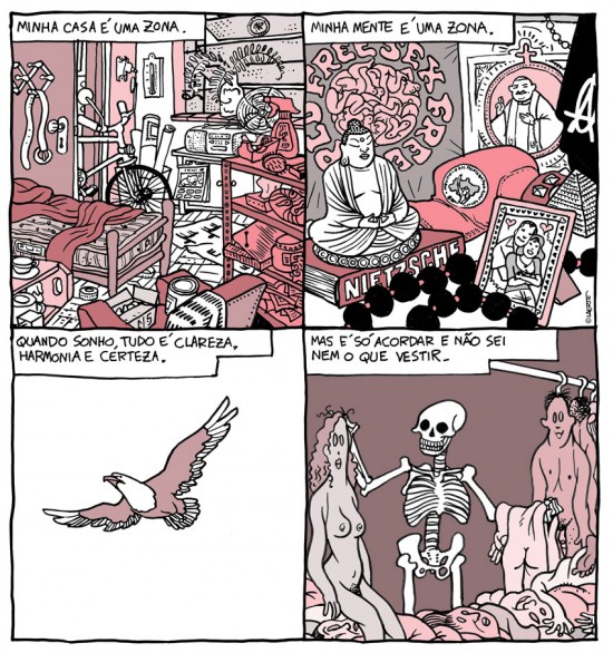 E aí eu falei, com plena consciência de que o estava constrangendo de forma irremediável. Abri a boca para comentar um detalhe na capa do livro que estávamos bolando e saiu assim: não há, nos quadrinhos, nas artes plásticas e, no fim do dia, em qualquer arte narrativa, alguém que esteja fazendo algo próximo ao que você faz. Não há artista tão difícil de definir, uma obra que tenha feito tanto em tão pouco espaço. Uma capacidade natural, que de fora aparece como sem esforço, de mudar os próprios rumos, de abandonar qualquer fórmula de sucesso em prol de uma irrevogável vontade de fazer o que bem entende.