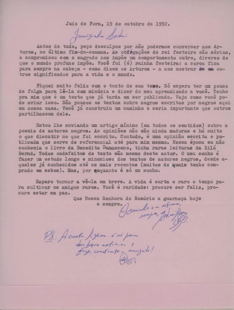 Carta do escritor Edimilson de Almeida Pereira falando de sua experiência como Rei Festeiro da Comunidade dos Arturos e da tese de Leda sobre o Reinado, 1992