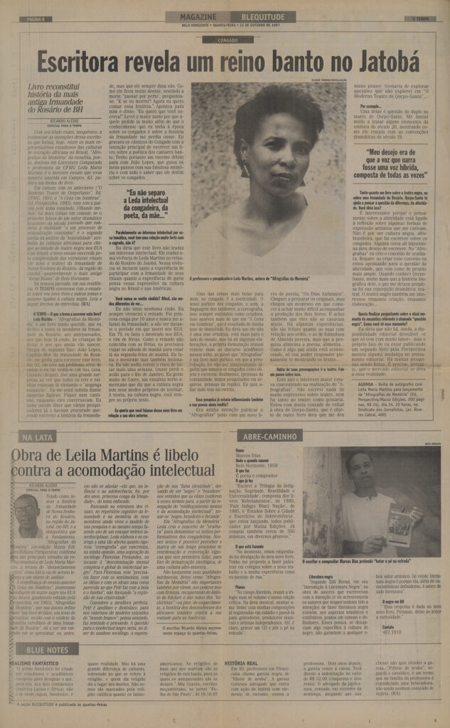 Artigo “Escritora revela um reino banto no Jatobá”, escrito por Ricardo Aleixo para o jornal O Tempo, Belo Horizonte, 1997