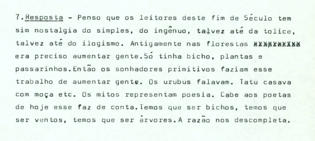 Trecho de entrevista dada por Manoel de Barros a Alexandre Martins e João Domenech (sem data)