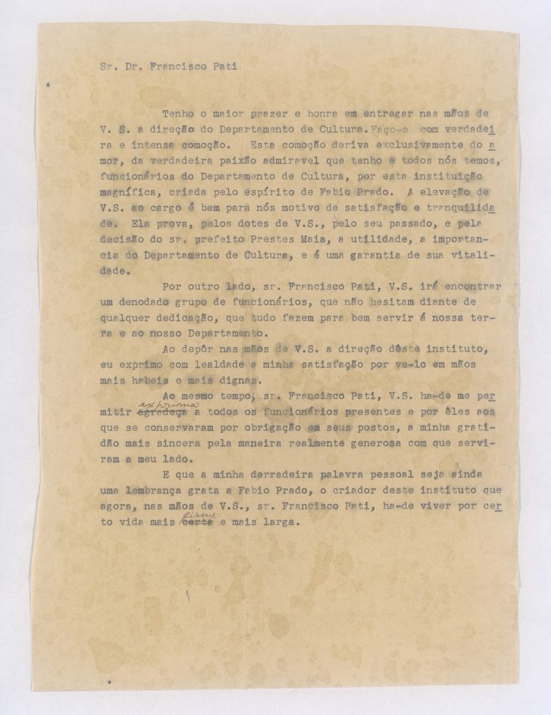 Carta de Mário a Francisco Pati, a quem passa a direção do Departamento de Cultura, com a substituição de Fábio Prado por Prestes Maia na Prefeitura de São Paulo