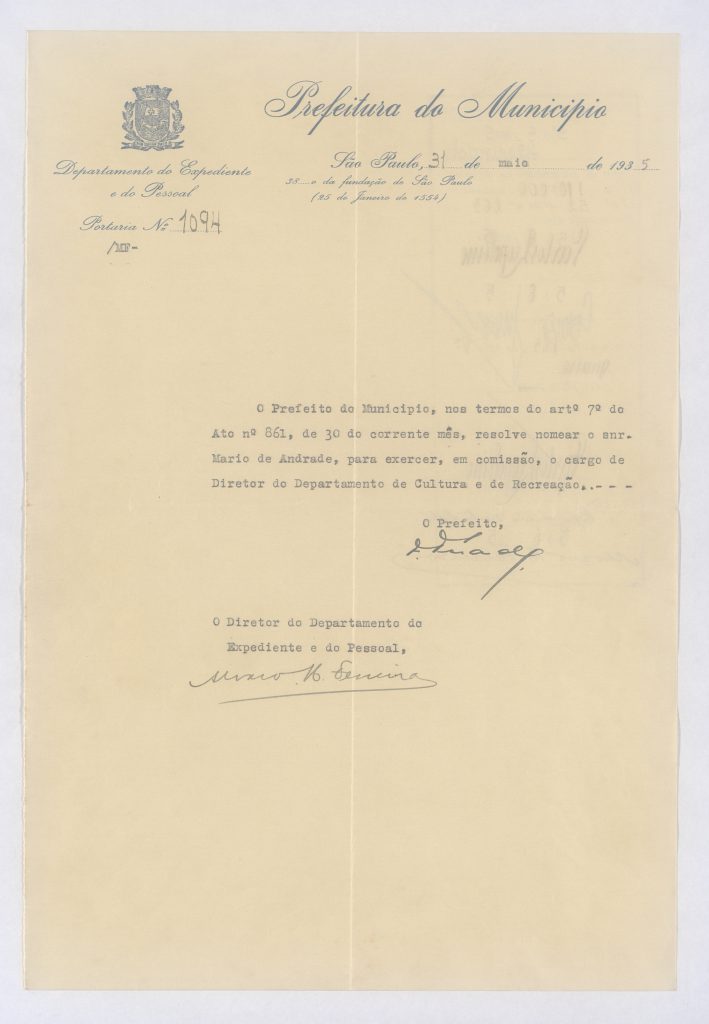 Portaria nº 1094. São Paulo, 31/5/1935, que nomeia Mário como diretor do Departamento de Cultura | imagem: Instituto de Estudos Brasileiros