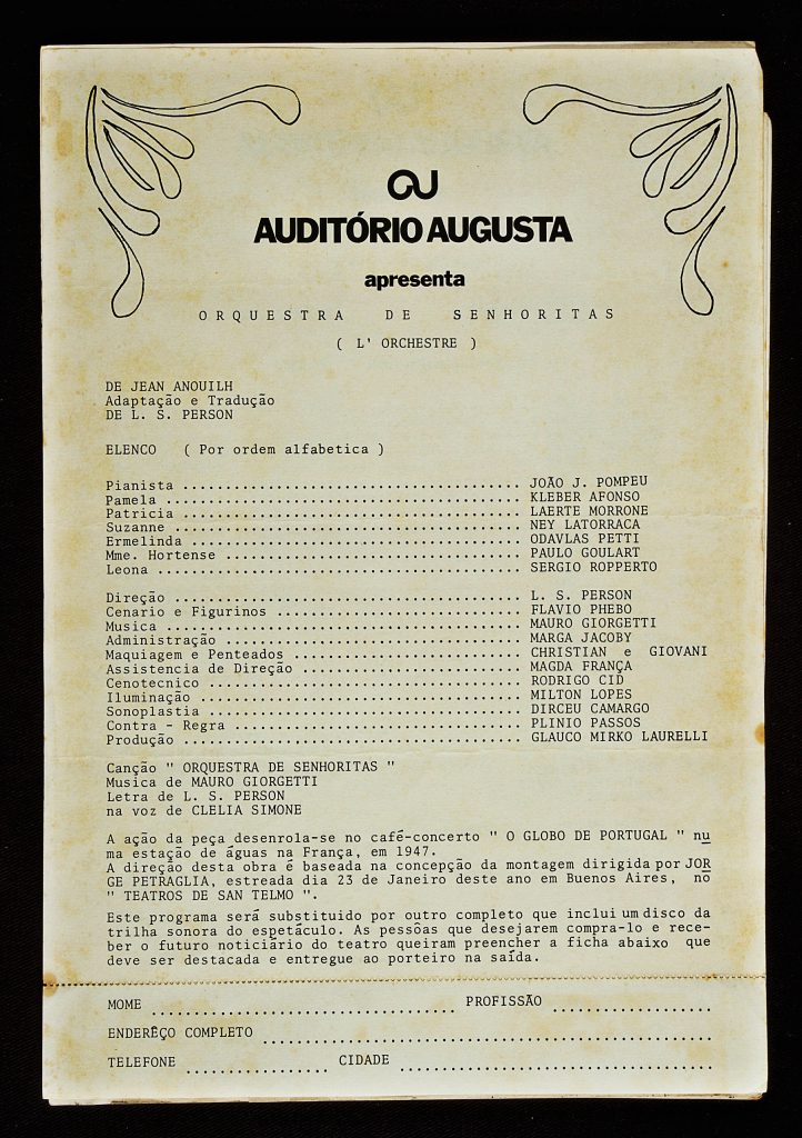 Mauro Giorgetti (1947) é regente e maestro, autor de várias trilhas sonoras para cinema. Compôs a trilha da peça Orquestra de Senhoritas (1974/1975), dirigida por Luiz Sergio Person, seu único trabalho para teatro.