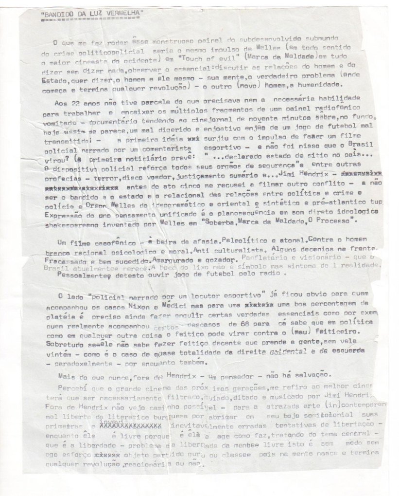 Durante sua vida, Rogério Sganzerla reuniu, em dezenas de cadernos e pastas, anotações, argumentos e roteiros de seus filmes. Páginas que revelam o processo de criação do cineasta e a maneira como pensava e concebia as sequências de obras antológicas, como O Bandido da Luz Vermelha, A Mulher de Todos e Abismu.