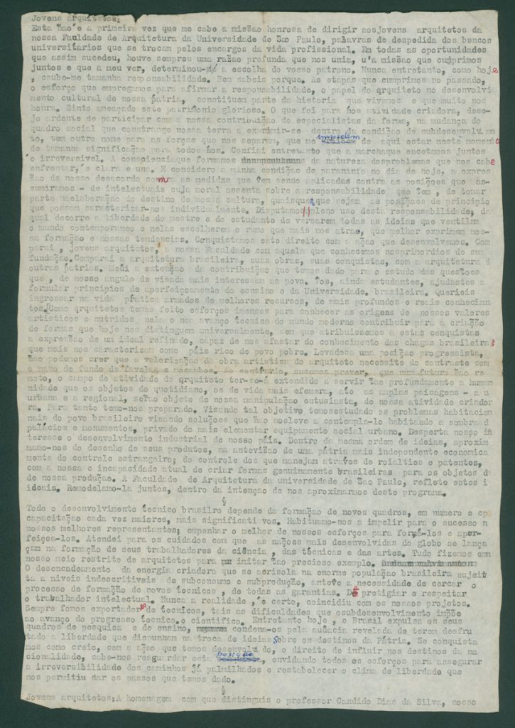 "Aos Formandos da FAUUSP", discurso de paraninfo aos novos bacharéis da Faculdade de Arquitetura e Urbanismo (FAU) da Universidade de São Paulo. Escrito durante o exílio — em novembro de 1964, no Uruguai — o texto foi lido no Brasil por Paulo Mendes da Rocha | Imagem: Acervo da Família Artigas