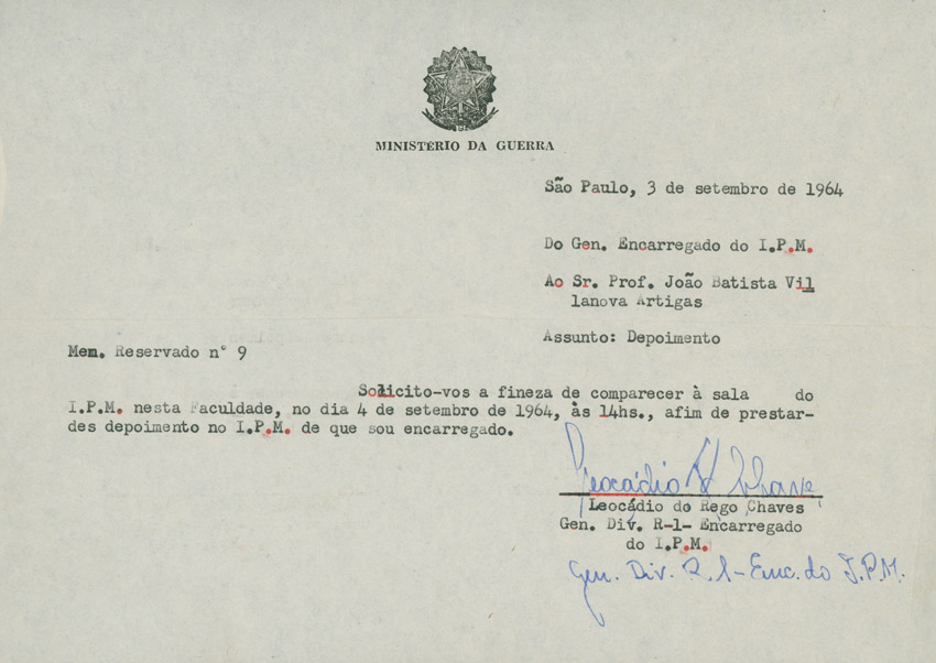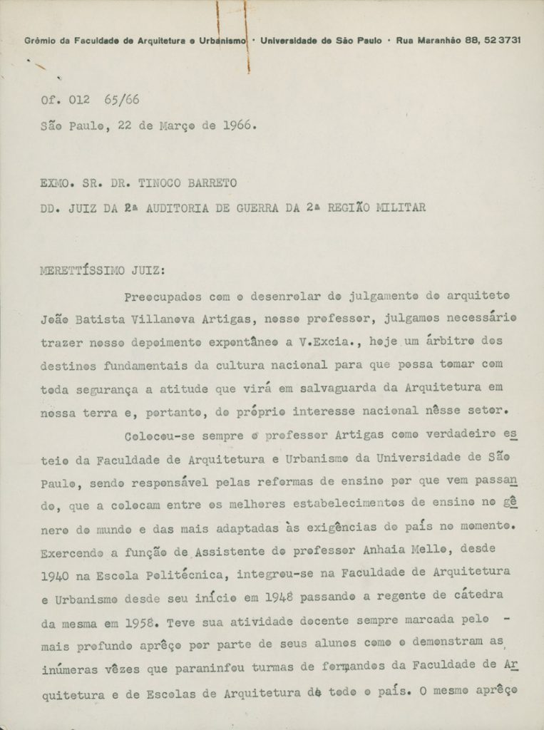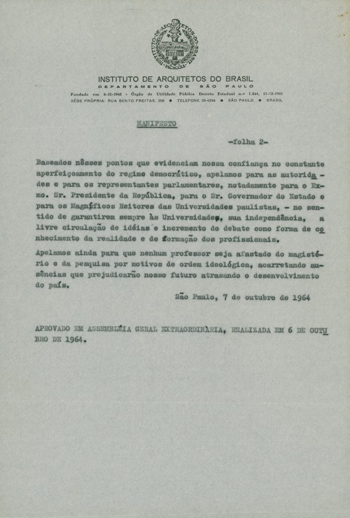 O departamento paulista do Instituto dos Arquitetos do Brasil (IAB), do qual Artigas foi um dos fundadores, repudia os processos iniciados contra professores pela ditadura civil-militar | Imagem: Acervo da Família Artigas
