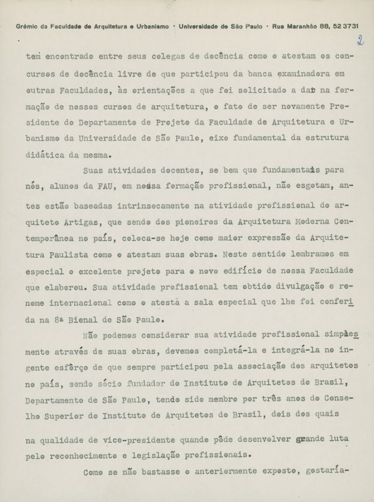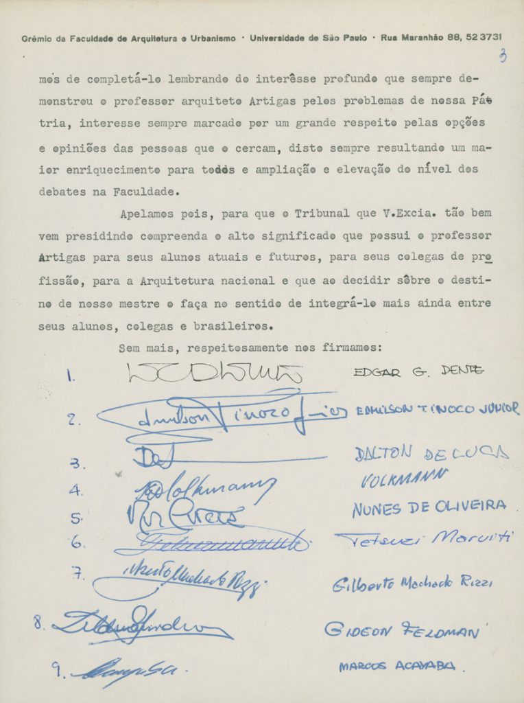 O grêmio dos alunos da Faculdade de Arquitetura e Urbanismo (FAU) da Universidade de São Paulo (USP) repudia o processo iniciado contra Artigas. A lista de assinaturas prossegue além do que publicamos aqui | Imagem: Acervo da Família Artigas